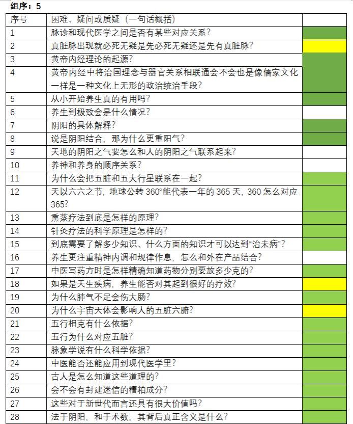 預(yù)計(jì)到這一結(jié)果,因此,在課程開始之前我們教學(xué)團(tuán)隊(duì)就啟動(dòng)了課程專題學(xué)習(xí)的準(zhǔn)備工作,多少可以局部補(bǔ)償學(xué)生這些方面的缺陷。作為準(zhǔn)備工作之一,要求各小組做一些設(shè)計(jì)專題相關(guān)內(nèi)容的專題學(xué)習(xí)分享,并將課下學(xué)習(xí)過程中的困惑、疑問和質(zhì)疑進(jìn)行匯總,帶至課堂進(jìn)行討論。學(xué)生碰到的困惑疑慮比課程團(tuán)隊(duì)的預(yù)期要多,比如對(duì)《黃帝內(nèi)經(jīng)》具體內(nèi)容的不解,對(duì)與固有常識(shí)的相悖的困惑等等(見圖2)。