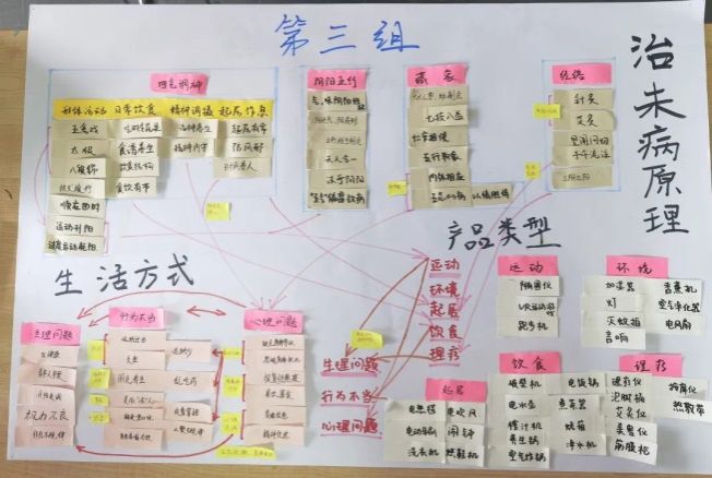 “治未病”專題的學(xué)習(xí)對(duì)本課程來說是一個(gè)設(shè)計(jì)練習(xí)和實(shí)踐選題的切入方式,而不是主要目的。因此,能否通過專題學(xué)習(xí)來找到有價(jià)值、有潛力的設(shè)計(jì)機(jī)會(huì),才是專題學(xué)習(xí)在課程框架內(nèi)的目的。專題第三階段的主要任務(wù)是設(shè)計(jì)機(jī)會(huì)挖掘,需要高強(qiáng)度的思維發(fā)散,在更廣泛的范疇內(nèi)來探尋設(shè)計(jì)機(jī)會(huì)。因此,專題第三階段的安排是一個(gè)高密度的連續(xù)頭腦風(fēng)暴的過程,主要從三個(gè)方向切入,并做交叉碰撞。第一是關(guān)于所學(xué)的《黃帝內(nèi)經(jīng)》的治未病原理、方法或做法;第二是當(dāng)下社會(huì)和現(xiàn)實(shí)生活的可能的問題和痛點(diǎn);第三是可參照的相關(guān)產(chǎn)品和品牌。(見圖5-6)
