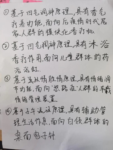 第五階段已經(jīng)是課程周期的中間階段了,各組的選題確定,設(shè)計(jì)定義明確,也有了初步的概念。在此基礎(chǔ)上,可以做一些更有針對(duì)性的調(diào)研、咨詢和驗(yàn)證工作,也需要一次中期匯報(bào)確認(rèn)各組的概念思路。因此,在專題進(jìn)行的中間階段,組織了以“《黃帝內(nèi)經(jīng)》中的設(shè)計(jì)機(jī)會(huì)”為主題的課程匯報(bào)交流活動(dòng),為各組的課題進(jìn)展做一次交流。每組匯報(bào)之后,教師與企業(yè)人員通過連線,共同進(jìn)行點(diǎn)評(píng)。針對(duì)每一組的設(shè)計(jì)定義和初步概念,從養(yǎng)生原理、應(yīng)用技術(shù)、用戶需求、產(chǎn)業(yè)動(dòng)態(tài)等不同的角度提供了豐富的意見和建議,發(fā)現(xiàn)了不少之前設(shè)計(jì)構(gòu)思中的盲點(diǎn),啟發(fā)了一些新的設(shè)計(jì)思路,為各小組下一步的工作提供了更立體的指導(dǎo)意見。