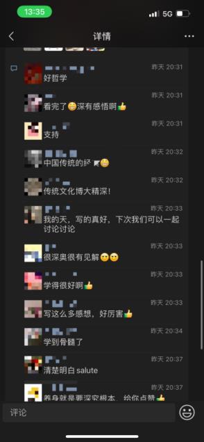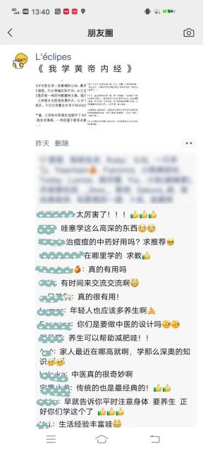 在此基礎(chǔ)上,給學(xué)生布置了一個(gè)題為《我學(xué)<黃帝內(nèi)經(jīng)>》的任務(wù),就是以靈活的、個(gè)性化的方式表達(dá)在朋友圈發(fā)布他們專題學(xué)習(xí)收獲和啟發(fā),作為一種初步市場(chǎng)調(diào)研和用戶研究方式,收集周邊人群對(duì)相關(guān)話題的看法。(見圖3)