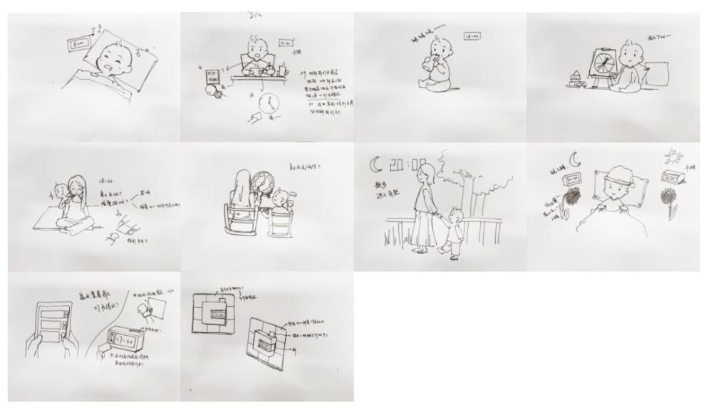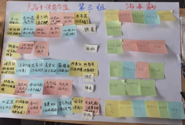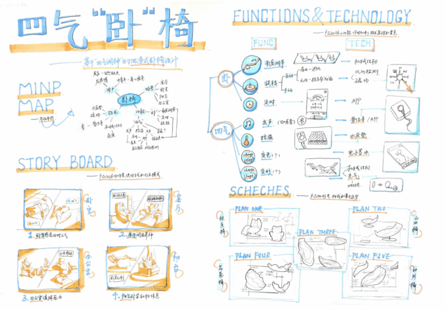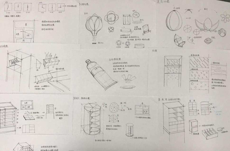 如果說前四階段為設(shè)計(jì)前期,那么從第五階段開始就進(jìn)入一個(gè)新的階段,也是更“設(shè)計(jì)”的階段。此前各組的選題和設(shè)計(jì)定義已經(jīng)明確,產(chǎn)品概念是在設(shè)計(jì)定義基礎(chǔ)上具象化的拓展,如果設(shè)計(jì)研究階段主要依賴認(rèn)知力和洞察,概念設(shè)計(jì)階段主要依賴想象力和創(chuàng)意。為此,課堂上和課后,安排了多輪次的頭腦風(fēng)暴、草圖構(gòu)思,小組討論等練習(xí)。當(dāng)然,設(shè)計(jì)定義、設(shè)計(jì)愿景、設(shè)計(jì)構(gòu)思、設(shè)計(jì)概念等環(huán)節(jié),并不是截然分開的,而是相互穿插在一起,有反復(fù)的情況也很正常。也就是說,通過設(shè)計(jì)構(gòu)思和設(shè)計(jì)概念的拓展,也會(huì)適當(dāng)調(diào)整設(shè)計(jì)定義。