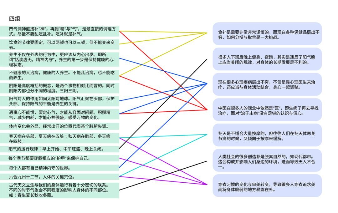 根據(jù)以往的教學(xué)經(jīng)驗(yàn),設(shè)計(jì)機(jī)會(huì)挖掘是專題設(shè)計(jì)的第二個(gè)難點(diǎn)。這個(gè)難點(diǎn)比之前的經(jīng)典學(xué)習(xí)方法情況要復(fù)雜一些。首先,學(xué)習(xí)經(jīng)典的關(guān)鍵是以古察古,因此所理解的內(nèi)容是在上古的社會(huì)背景下來闡述的,如何映射到當(dāng)下的時(shí)代背景和日常生活中是第一個(gè)挑戰(zhàn),比如內(nèi)經(jīng)講“恬淡虛無,真氣從之”,多少也能理解,也有不少距離感;其次,有不少學(xué)習(xí)收獲,可以直接應(yīng)用到日常生活中,改變行為即可,不一定需要特別的設(shè)計(jì)介入,比如四氣調(diào)神;再次,有不少設(shè)計(jì)機(jī)會(huì),但未必體現(xiàn)為產(chǎn)品的設(shè)計(jì)機(jī)會(huì),比如關(guān)于子午流注的日常作息提醒,APP的信息設(shè)計(jì)即可處理。