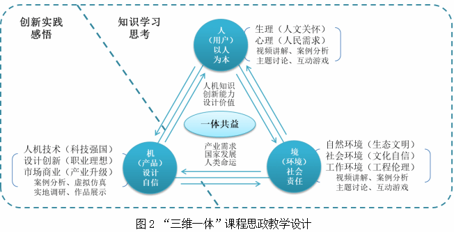 第二,在課程思政整體建設(shè)思路上,以“人—機(jī)—環(huán)境”的課程內(nèi)容為框架,構(gòu)建“三維一體”的課程思政教學(xué)設(shè)計(jì):從用戶維度融入“以人為本”的核心理念和美好生活的珍惜向往;從環(huán)境維度融入社會責(zé)任與歷史責(zé)任的創(chuàng)新視角;從產(chǎn)品維度融入設(shè)計(jì)自信、文化自信與職業(yè)道德,最終以“人—機(jī)—環(huán)境”三個維度構(gòu)建人機(jī)系統(tǒng)的和諧統(tǒng)一,推進(jìn)對人機(jī)交互知識、創(chuàng)新能力、設(shè)計(jì)價值和產(chǎn)業(yè)需求、國家利益、人類命運(yùn)之間“一體共益”理念的闡述與理解。
