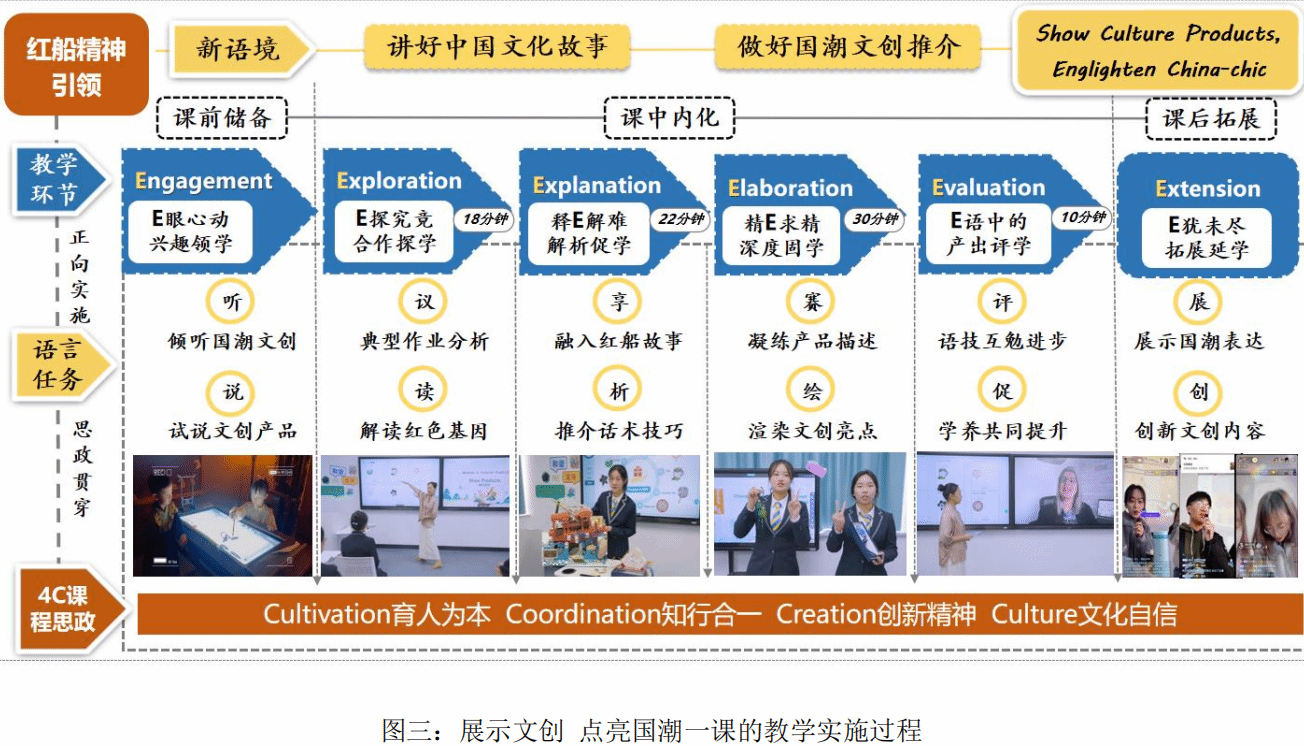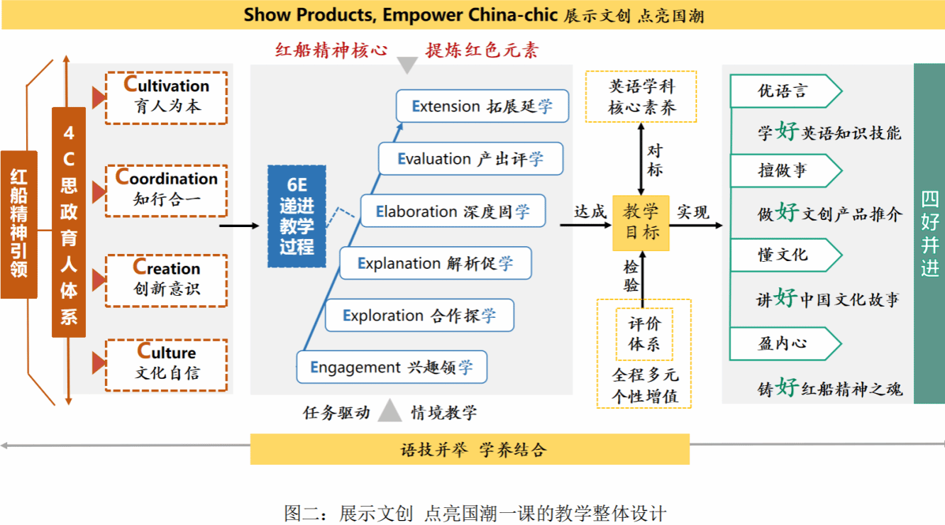 Show Products, Empower China-chic(展示文創(chuàng) 點(diǎn)亮國潮)一課選自拓展模塊四 China-chic Cultural Products(國潮文創(chuàng))。授課對象為文化創(chuàng)意策劃專業(yè) 2022 級 1 班學(xué)生。依據(jù)語言學(xué)科核心素養(yǎng)發(fā)展要求與職業(yè)語用需求,將 4C 思政育人要素全面滲透至教學(xué)目標(biāo)、內(nèi)容、手段與評價(jià)。在建構(gòu)主義 5E 教學(xué)模式上增加了 Extension(課后拓展延學(xué))環(huán)節(jié),形成 6E 遞進(jìn)教學(xué)模式。以紅色文化為亮點(diǎn),采用任務(wù)驅(qū)動(dòng)、情境教學(xué)等多種教法學(xué)法,搭建知識支架;以紅船精神為核心,構(gòu)建職業(yè)情境,打造沉浸式英語學(xué)習(xí)環(huán)境;靈活活使用資源手段破重化難,全過程多元評價(jià),以核心素養(yǎng)為基礎(chǔ),語技并舉,學(xué)養(yǎng)結(jié)合,將課程優(yōu)語言、擅做事、懂文化、盈內(nèi)心的目標(biāo)具象化為四“好”并進(jìn)教學(xué)效果。