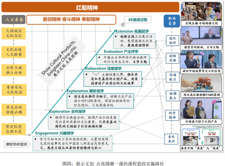 以德育為,,育人為本,以紅船精神為指引,以文創(chuàng)推助助力國潮出圈為內(nèi)容載體 4C 課程思政為體系進(jìn)行思政傳達(dá)。學(xué)生從課前穿越歷史,走進(jìn)現(xiàn)實(shí),用心感受中國人的智慧,到課中對紅船故事進(jìn)一步理解,再到融紅色基因和中國傳統(tǒng)文化元素于語言的表達(dá),直至課外實(shí)踐直播,展現(xiàn)文化自信,引導(dǎo)學(xué)生做有追求、有膽識、有擔(dān)當(dāng)?shù)募t船青年。