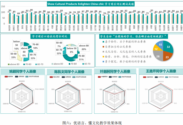 教與學(xué)充滿交互性、趣味性、挑戰(zhàn)性,符合 00 后學(xué)生的心理特質(zhì)和認(rèn)知規(guī)律。通過平臺搶答、小組活動(dòng)、“心”主播招募賽等形式,調(diào)動(dòng)每一位同學(xué)的學(xué)習(xí)熱情,課堂參與度高。學(xué)生理解并踐行了奮斗精神,所學(xué)知識技能快速得到驗(yàn)證,增強(qiáng)了獲得感。通過前后測試對比,學(xué)生的職場涉外溝通、多元文化交流、語言思維提升和自主學(xué)習(xí)完善的英語學(xué)科核心素養(yǎng)得到了全面培育。
