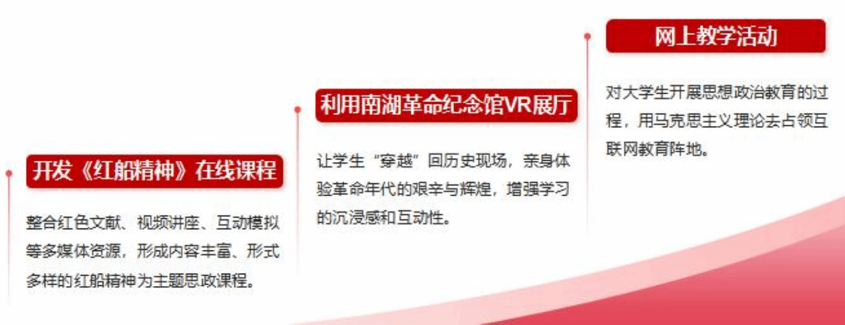 開發(fā)《紅船精神》在線課程,整合紅色文獻(xiàn)、視頻講座、互動(dòng)模擬等多媒體資源,形成內(nèi)容豐富、形式多樣的紅船精神為主題思政課程,學(xué)生在高校思政課教學(xué)中重溫歷史,感受紅色精神的傳承,增強(qiáng)學(xué)習(xí)的沉浸感和體驗(yàn)感。利用南湖革命紀(jì)念館 VR 展廳等網(wǎng)絡(luò)資源,讓學(xué)生“穿越”回歷史現(xiàn)場(chǎng),親身體驗(yàn)革命年代的艱辛與輝煌,增強(qiáng)學(xué)習(xí)的沉浸感和互動(dòng)性。組織學(xué)生在網(wǎng)上通過“網(wǎng)上觀影”、“網(wǎng)上閱讀”、“網(wǎng)上討論”等一系列網(wǎng)上教學(xué)活動(dòng),對(duì)大學(xué)生開展思想政治教育的過程,用馬克思主義理論去占領(lǐng)互聯(lián)網(wǎng)教育陣地。