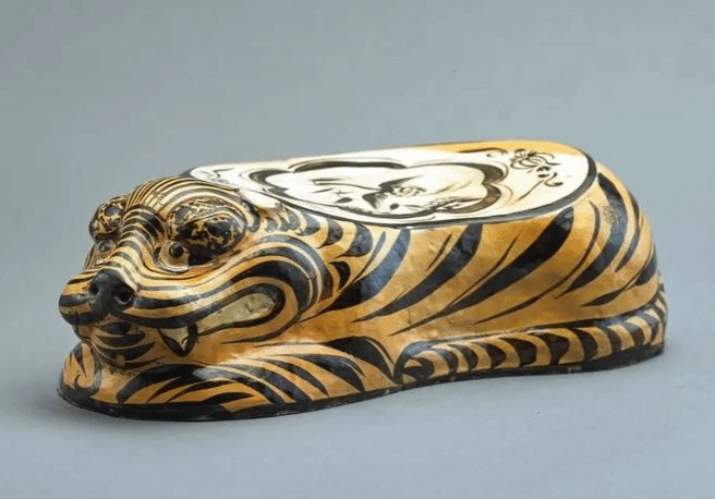 黃地黑彩雁銜蘆葦紋虎枕