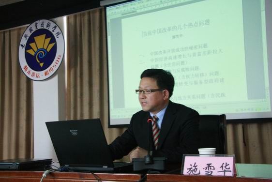 2010月22日下午行政樓506會議室,由嘉興籍著名學(xué)者、北京師范大學(xué)政治學(xué)與國際關(guān)系學(xué)院施雪華教授走上“勤禾”論壇,為全院全體中層及助理以上干部作了一場精彩的講座,主題為“當(dāng)前中國改革的幾個(gè)熱點(diǎn)問題”。