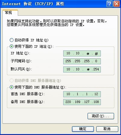 4.在常规下选择使用下面的IP地址,输入“IP地址:10.10.*.#”子网掩码:255.255.255.0”默认网关:10.10.*.254”;再选择中使用下面的DNS服务器地址,然后输入首选DNS服务器:10.1.1.12”备选DNS服务器:202.189.127.108”,然后点击[确定]完成全部设置。(注:地址中的*#视电教网络中心对全院IP地址的规划而定,请咨询后再行设置,不要随意设置,以免因IP地址冲突影响他人工作。)