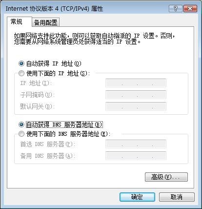 在“常规”下,选中“自动获得IP地址”,再选中“自动获得DNS服务器地址”,然后点击[确定]。