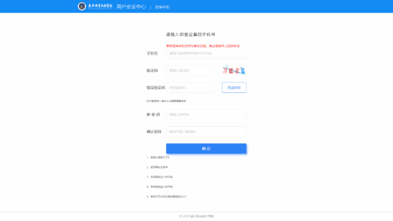 一开始登录时候会出现要填写请输入您要设置的手机号原密码默认身份证后六位,同时系统会要求同学修改密码强度。手机号必须填写学生本人使用手机号码,点击发送验证码后,获取短信验证码。