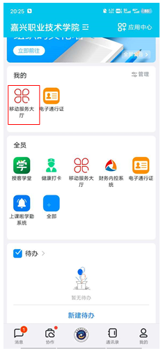 。在底部点击工作台(工作台可能是嘉职院标志)将目前的界面切换工作台界面,工作台界面(图6)里包含了大量学校的应用其中有移动服务大厅,点击移动服务大厅并找到迎新系统(图7),完成入学一件事的各项功能使用。