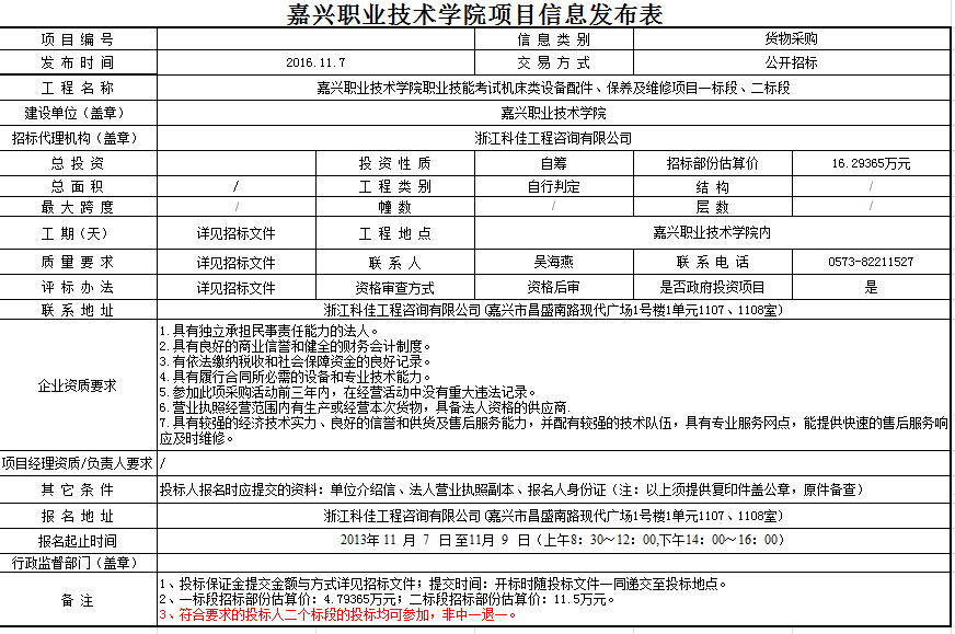 嘉興職業(yè)技術(shù)學(xué)院職業(yè)技能考試機床類設(shè)備配件、保養(yǎng)及維修項目采購信息發(fā)布表
