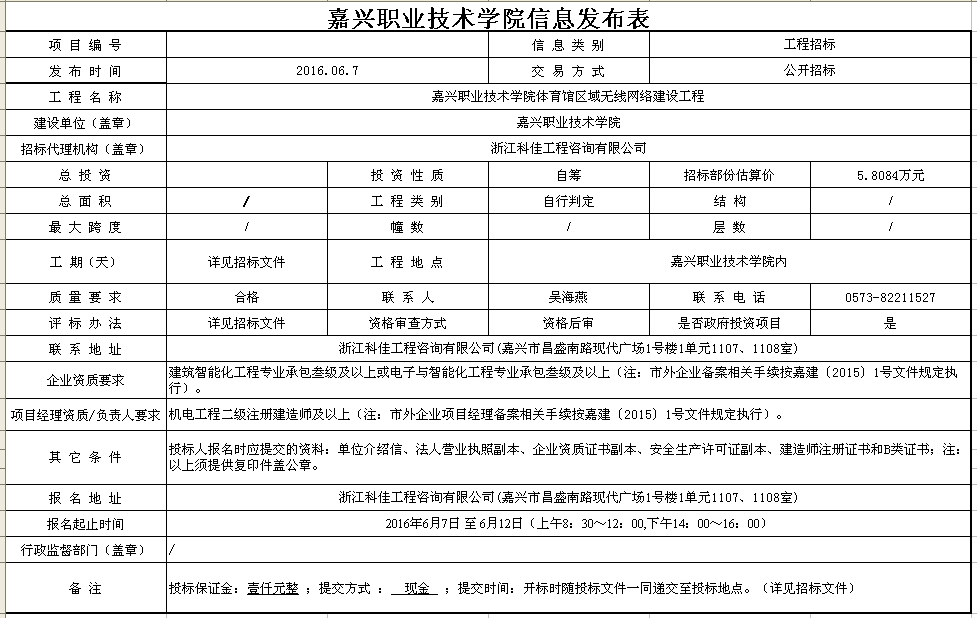 嘉興職業(yè)技術學院體育館區(qū)域無線網絡建設工程信息發(fā)布表